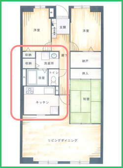マンションの場合、窓のある外周部にリビングダイニングや居室を設置することから、キッチンが住戸の中央部に設置されることが多くなります。キッチンやトイレ、洗面所、浴室といった「水回り」は、窓のない中央部に集められてしまうのです。