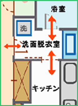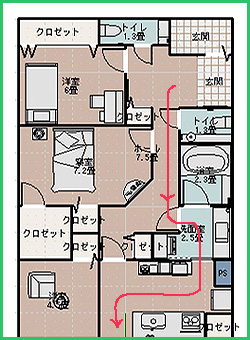 玄関から遠回りになると、食料品を買い込んできたとき、重たい荷物を持って長い距離を歩かなければなりません。加えて、キッチンは家事作業の中心であり、主婦は料理を作りながら、洗濯をしたり、お風呂を洗ったりします。このような家事作業を効率よく行うため、できるだけ「遠回り」をしたくないですよね?